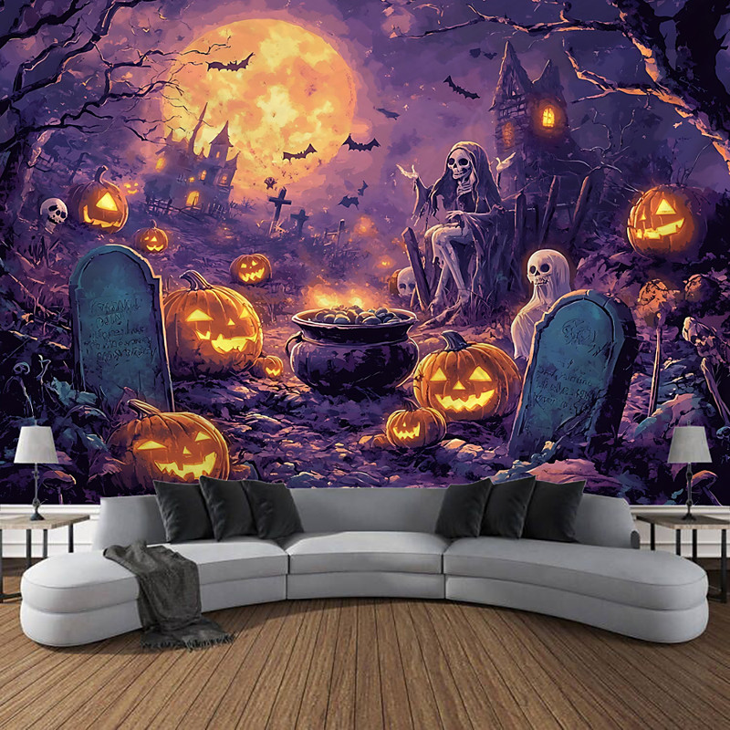 Halloween Photograph Backdrop Tapestry, Ghosts, Pumpkins, Monsters, and Skeletons Pattern Wall Hanging, Large Decorative Mural for Bedroom, Living Room, Party, and Home Decoration
