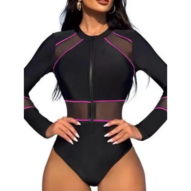 Women's One Piece Swimsuit zip front Monokini Tummy Control High Waist Slim Vacation Beach Wear Solid Color High Neck Long Sleeve Bathing Suits
