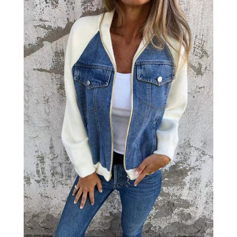 Women's Casual Jacket Denim Jacket Warm Comfortable Zipper Pocket Retro Casual Color Block Vacation Home Daily Wear Going out Regular Stand Collar Regular Fit Long Sleeve Outerwear Blue Black White