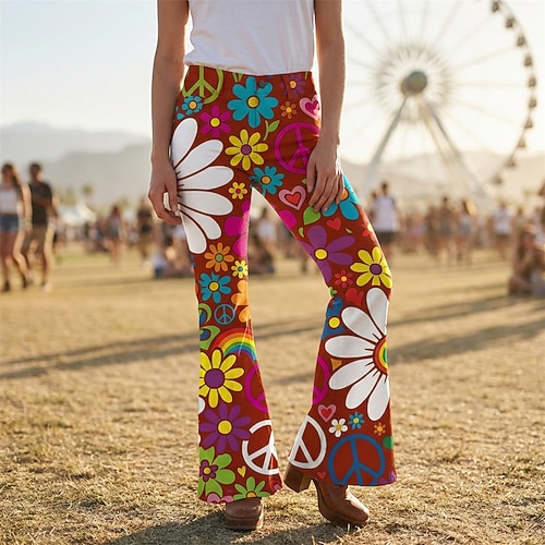 Retrò Vintage Boho Anni '70 Pantaloni Pantaloni a zampa d'elefante Hippie Disco Vita alta Floreale Simboli di pace Costume Per donna Halloween Carnevale Festival Musicale Festa a tema retrò Adulti