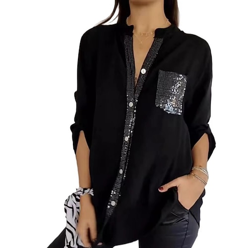 Per donna Blusa Tinta unica Elegante Casual Manica Lunga Scollo a V Top Regolari Quotidiano Paillettes Tasca Nero Bianco Cachi Primavera Autunno Inverno