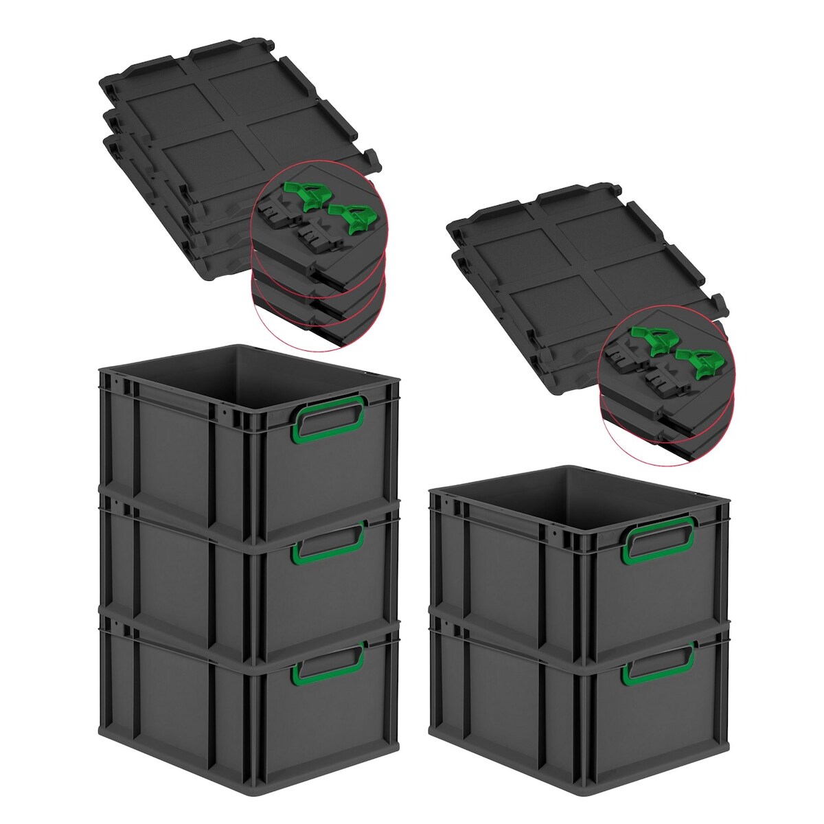 PROREGAL SuperSparSet 5x Eurobox NextGen Color mit Scharnierdeckel & Verschlüssen, HxBxT 22x30x40cm, 20L, Schwarz, Griffe grün zu, Eurobehälter