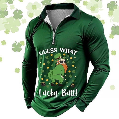 San Patrizio Per uomo Quadrifoglio Polo con zip Manica Lunga Magliette polo Camicie con Colletto Casual All'aperto Streetwear Athleisure Abito da festa Stampa 3D Primavera Autunno Nero Verde Blu