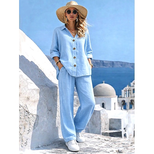 Per donna Set di biancheria in cotone Set di Pantaloni Manica Lunga Colletto a Camicia Tinta unica Elegante Moda Streetwear Casuale Quotidiano All'aperto Blu Primavera Estate Vestibilità comoda
