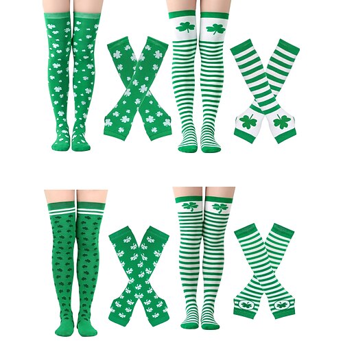 St. Patrick's Day Socke für Damen Armstulpen-Set, 4-teiliges Set aus kniehohen Socken mit Kleeblattmuster und fingerlosen Handschuhen, festliche Accessoires in Irischgrün für Damen Mädchen, perfekt