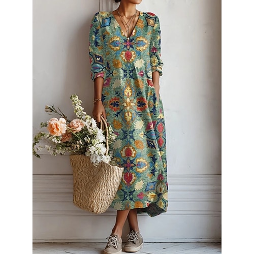 Per donna Abito Midi Vestito Estivo Abito a trapezio Vacanza Casual Boho Feste Ferie Spiaggia Vestibilità comoda Floreale Grafico Geometrico Manica Lunga Scollo a V Nero Blu Arancione Verde Estate