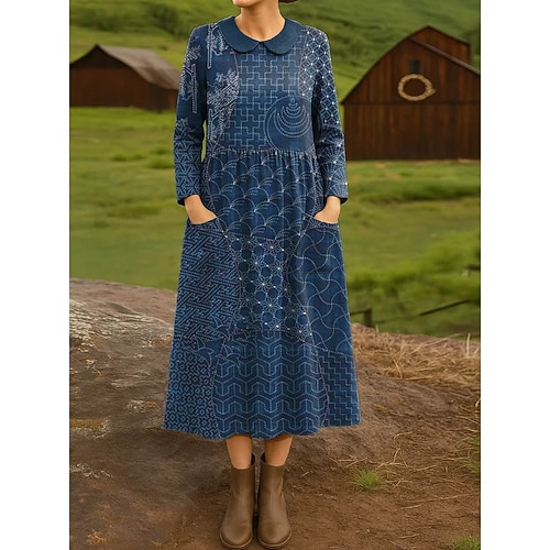 Per donna Abito Midi Tubino Abito Pieghettato Vacanza Casual Boho Ferie Abito Primaverile Vestibilità regolare Plaid Astratto Manica Lunga Girocollo Blu Marrone Scuro Marrone Verde Primavera Autunno