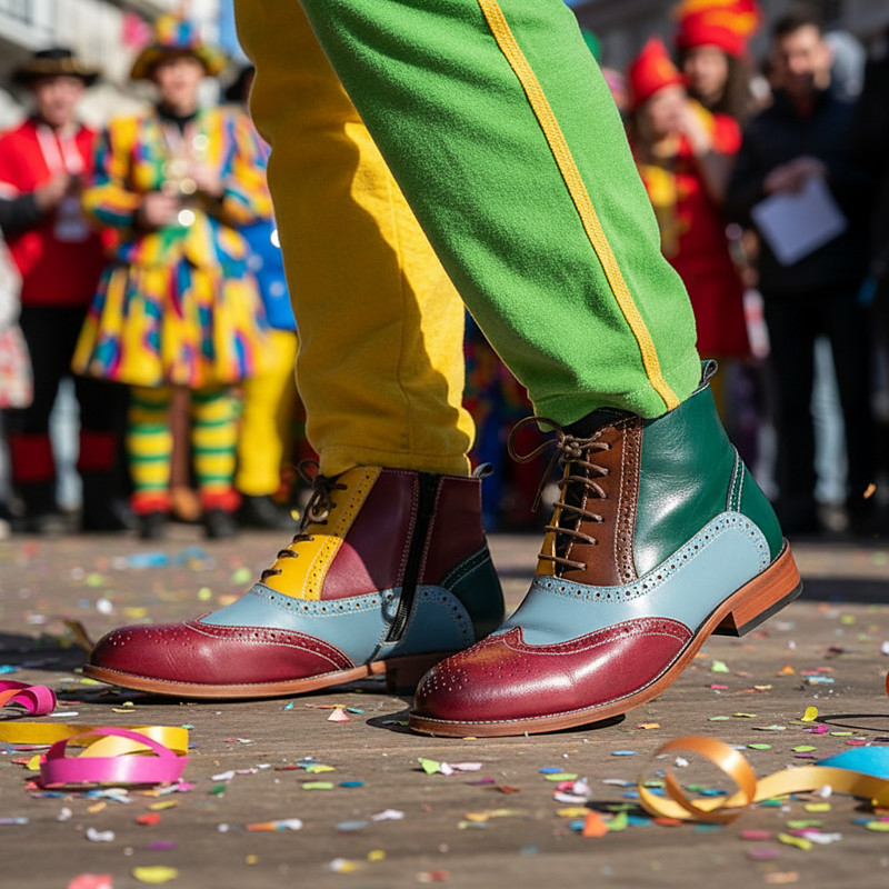 Men's Colorful Ankle Boots, Red, Blue, Green, and Brown, Stylish Lace-Up Design with Decorative Perforations, Perfect for Carnival and Festive Celebrations