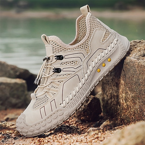 Scarpe da ginnastica da uomo beige per attività all'aperto, con lacci, traspiranti, leggere e comode, ideali per escursionismo, viaggi, campeggio, passeggiate su sentieri, avventure all'aria aperta e per uno stile sportivo casual quotidiano.