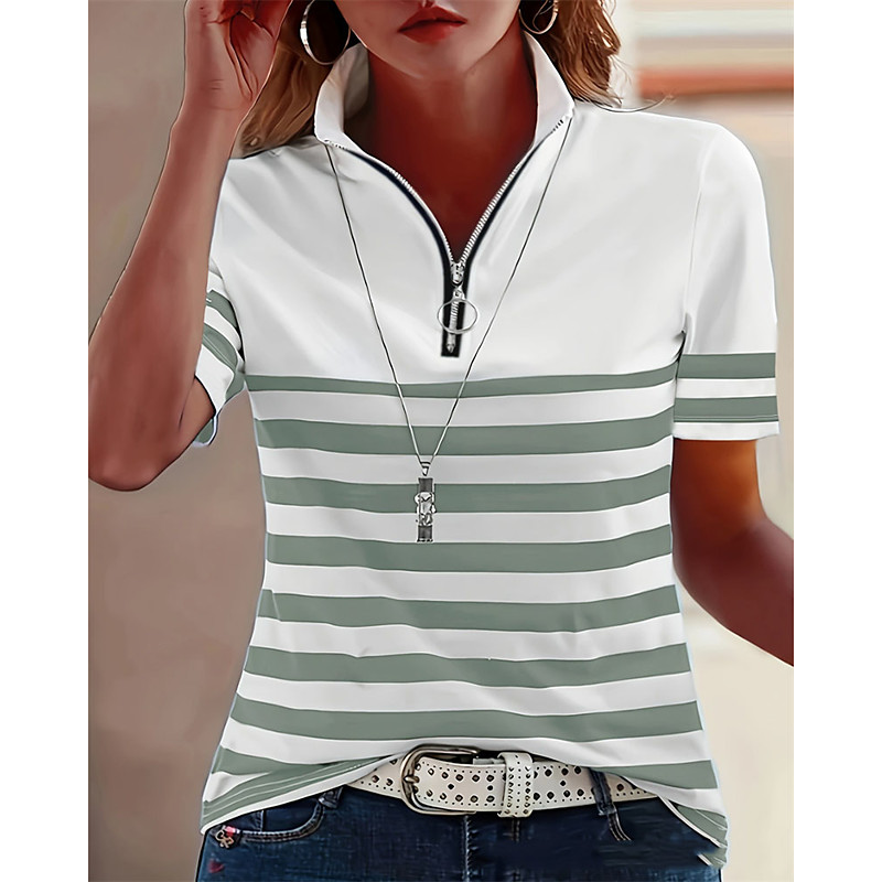 Women's T Shirt Summer Tops Graphic Geometric Striped Elegant Fashion Classic Short Sleeve High Neck Regular Tops Daily Going out Weekend Patchwork Quarter Zip Blue Black White Red Green Summer Spring