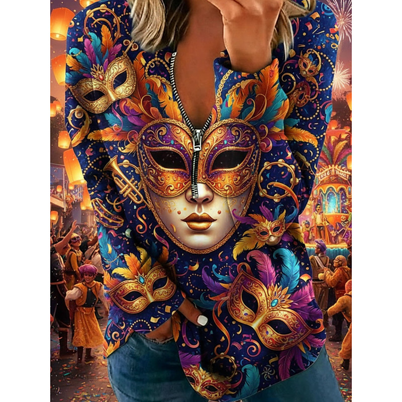 Carnival Women's Pullover Sweatshirt Graphic Vintage Casual Long Sleeve V Neck Regular Tops Street Dailywear Zipper Pocket Print Purple Spring Fall