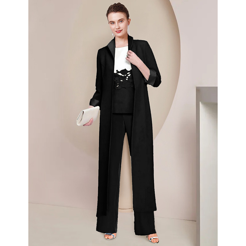 Jumpsuit Pantsuit 3 Piece Floor Length Mother of the Bride Dress 3/4 Length Sleeve Scoop Neck Elegant Formal Wedding Guest Lace Stretch Fabric Wrap Included with Appliques