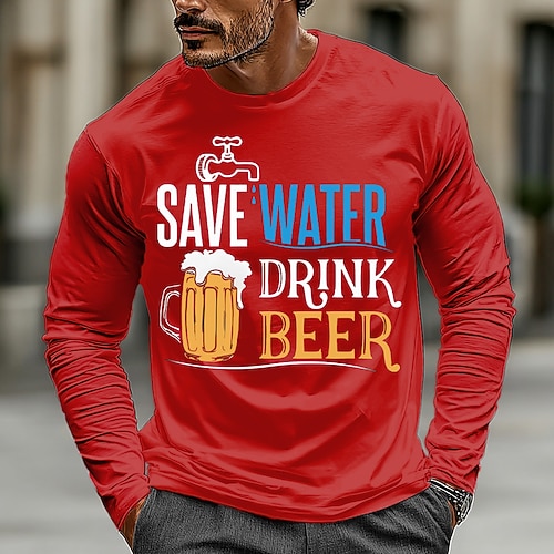 Herren-T-Shirt mit lustigem Slang-Spruch: Wasser sparen, Bier trinken. Langarmshirt mit 3D-Druck und Rundhalsausschnitt. Modisches Basic-Streetwear-Shirt in Blau, Rot und Grün. Erhältlich in den