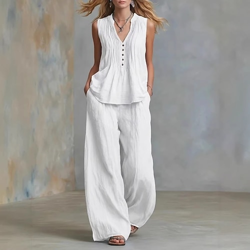 Per donna Set di Pantaloni Finto cotone e lino Senza Maniche Scollo a V Tinta unica Moda Streetwear Casuale Quotidiano All'aperto Blu Nero Bianco Primavera Estate Vestibilità comoda