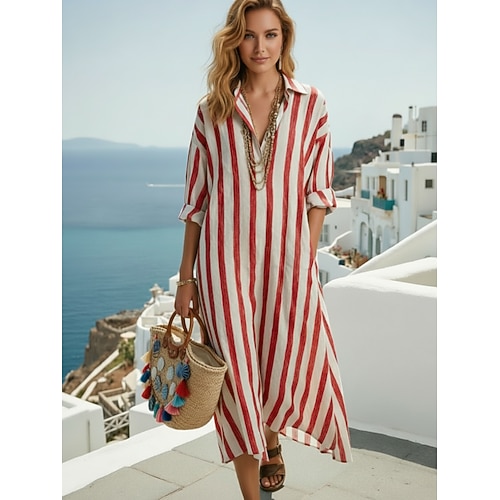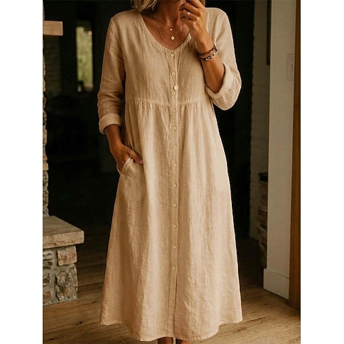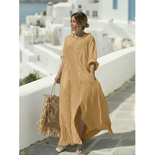 Per donna Abito maxi Finto cotone e lino Abito in cotone e lino Moda Moderno Quotidiano All'aperto Vacanza Vestibilità comoda Semplice Manica Lunga Scollo a V Nero Bianco Giallo Blu marino Estate