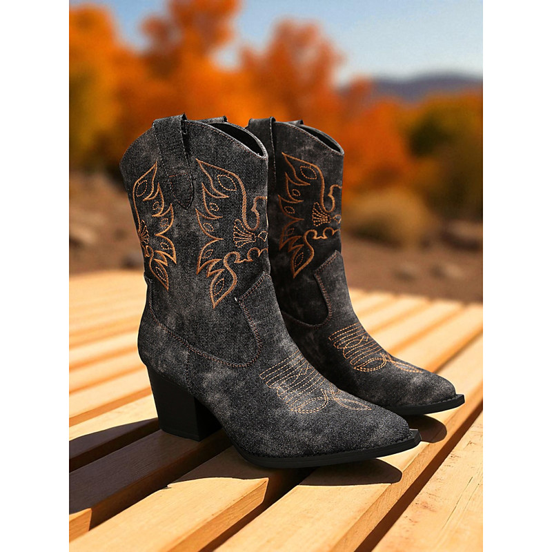 Women's Blue Denim Western Cowboy Boots with Embroidered Detail – Mid-Calf Pointed Toe Boots for Music Festivals, Rodeo Events and Country Style Outfits