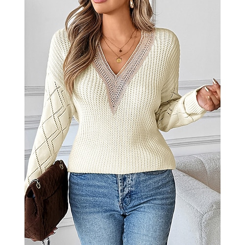 Per donna Maglione Elegante Carino Tinta unica Scollo a V Lavorato a maglia Manica Lunga Top Regolari Maglia All'aperto Lavoro Data Beige Primavera Autunno