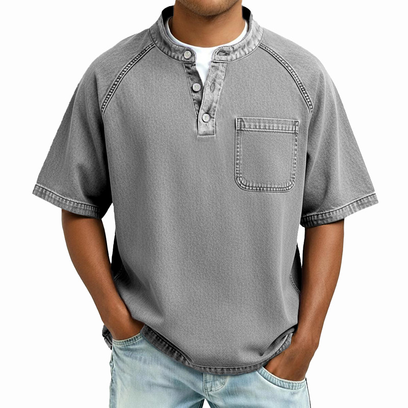 Men's T Shirt Henley Shirt 100% Cotton Acid Wash Shirt Tee Top Short Sleeve Plain Solid Vintage Streetwear Casual Pocket Washed Raglan Sleeves Henley Casual Home Street Spring Fall Fall Winter Blue