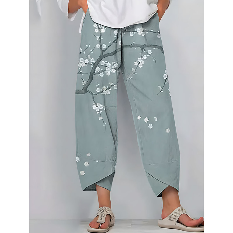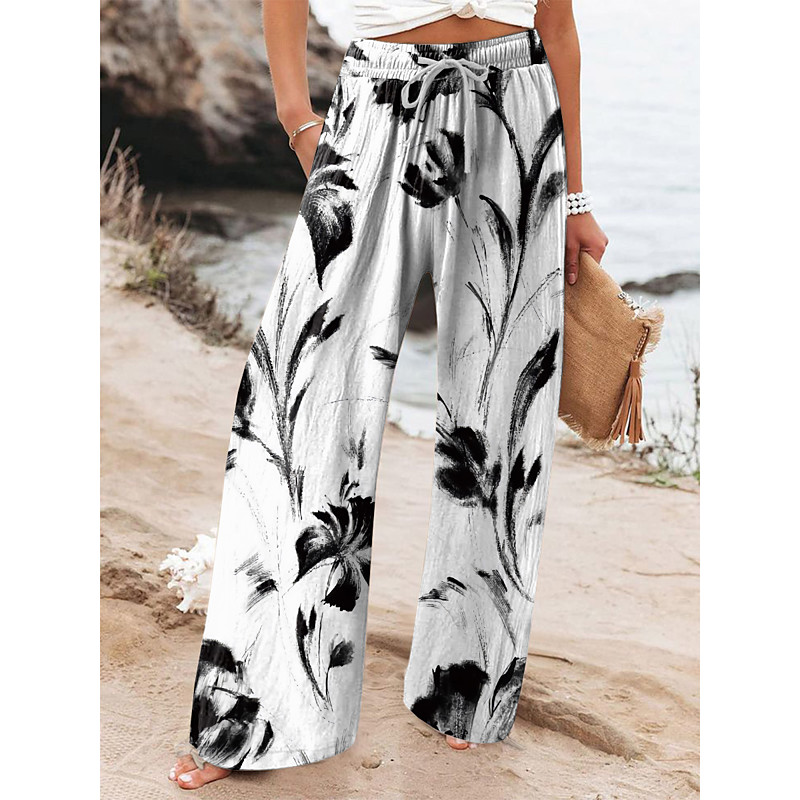 Women's Wide Leg Chinos Baggy Pants Vintage Basic Casual Ankle-Length High Waist Floral Graphic Drawstring Patchwork Printing Breathable Inelastic Outdoor Vacation Street Yellow Blue Green Beige