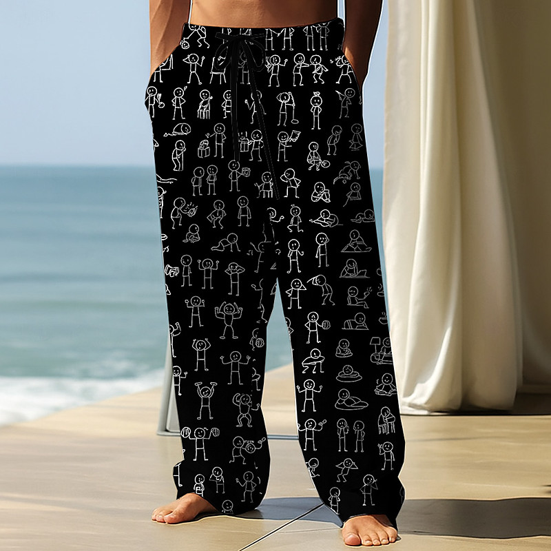 Men's Trousers Baggy Pants Casual Pants Elastic Drawstring Waist Linen-Like Pants with Pockets People Stick Figure Full Length Outdoor Vacation Funny Black White Inelastic