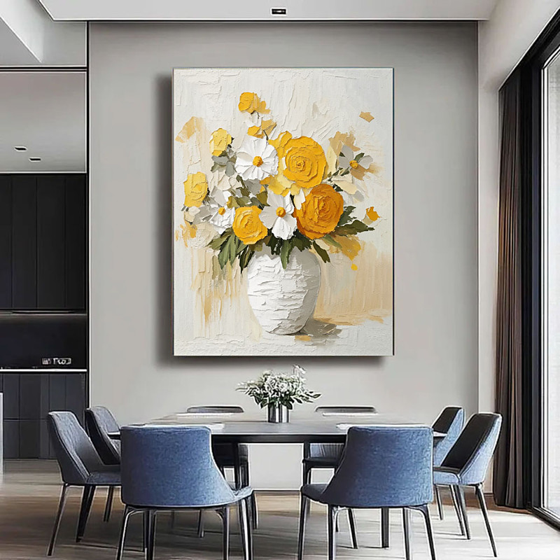 Original oil painting hand painted White Yellow Flower Painting Large Textured Fancy Floral paintings Wall Art Vertical Custom Art Modern Dining Room Wall Decor