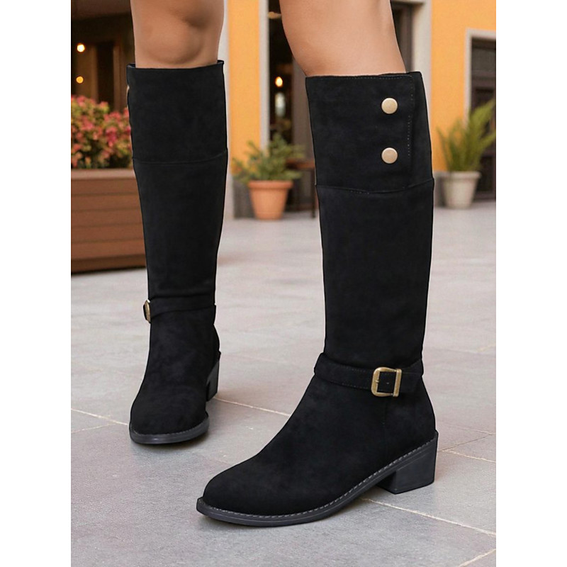 Women's Khaki Suede Knee High Boots with Buckle Strap - Classic Round Toe Low Heel Riding Boots for Fall Winter Casual Wear and Outdoor Fashion