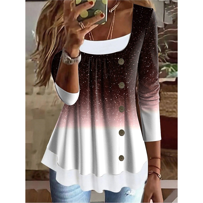 Women's T Shirt Ombre Graphic Vintage Stylish Classic Long Sleeve Square Neck Long Tops Daily Weekend Patchwork Buttons Print Red Blue Purple Green Spring Fall Winter