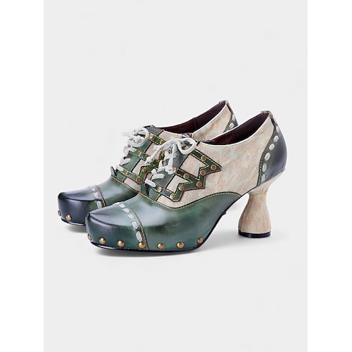 Damen Mardi Gras grüne und beige Leder Schnürstiefel mit Nietenverzierungen – Kühner Karnevalsstil perfekt für Umzüge Festlichkeiten und Feiern