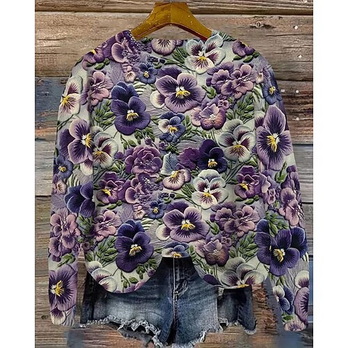 Per donna Misto cotone Maglietta Floreale Moda Casual Manica Lunga Scollo a V Top Regolari Quotidiano Uscire Stampato Rosso Arancione Marrone Verde Estate