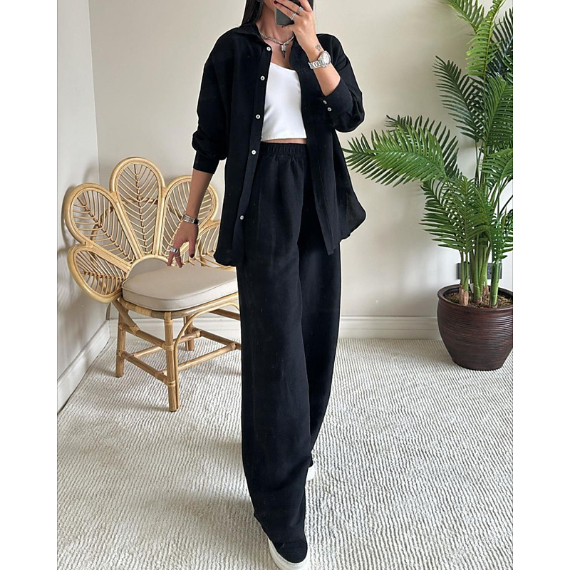 Women's Fashion Streetwear Shirt Pants Sets Bolero Top Long Sleeve Shirt Collar Plain Casual Daily Outdoor Blue Black White Spring Regular Fit