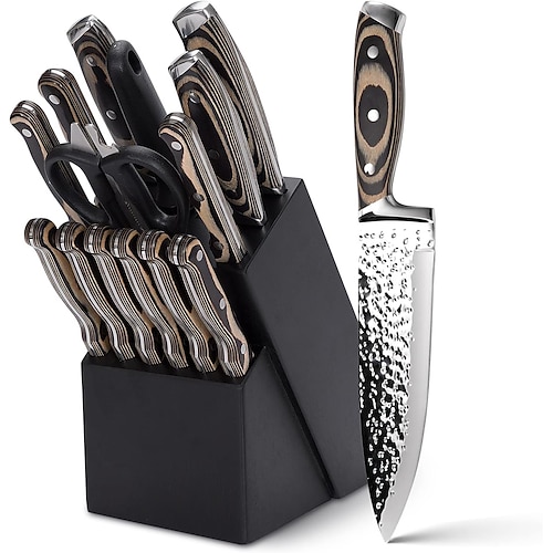 set di coltelliSet di coltelli da cucina da 15 pezzi con ceppo in legnoSet di coltelli in acciaio inossidabile giapponese ad alto tenore di carbonioDesign a codolo intero ultra affilatoMotivo a