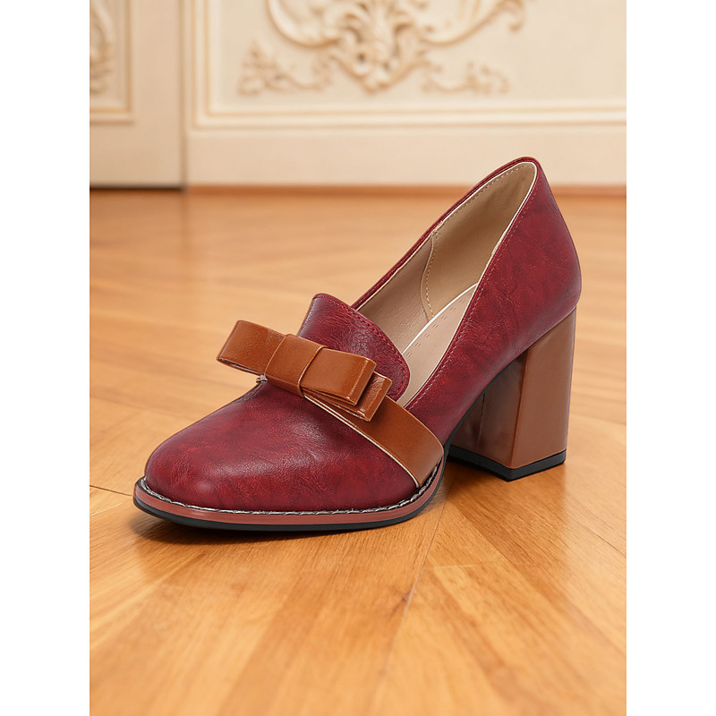 Women's Black Patent Leather Block Heel Ballet Pumps with Bow - Elegant Round-Toe Shoes for Work, Office Formal Events