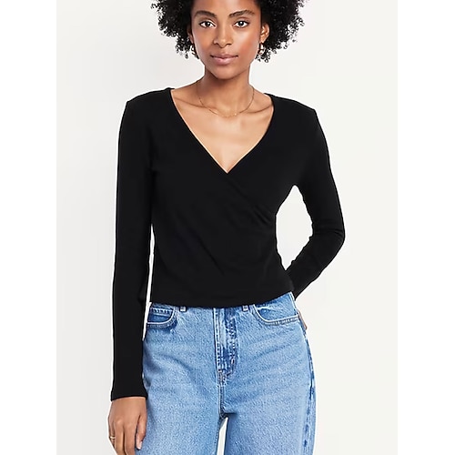 Per donna Tunica Tinta unica Elegante Vintage Essenziale Manica Lunga Scollo a V Top Regolari Quotidiano Nero Primavera Autunno