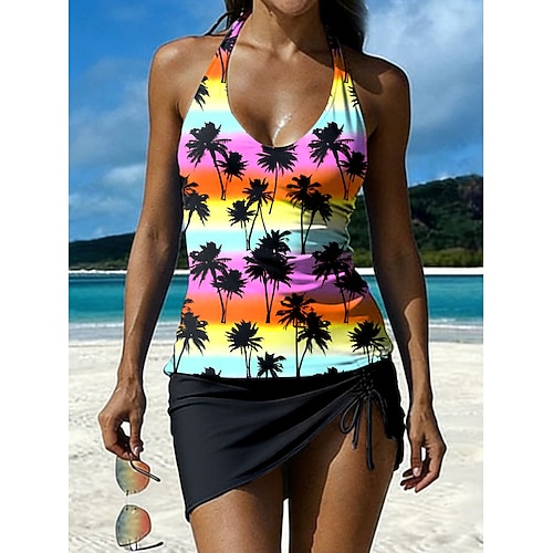 Costume da bagno tankini 2 pezzi donna gonna a palme alta vita volant sovrapposto senza schienale per le vacanze beach wear grafica ombre scollo a U senza maniche