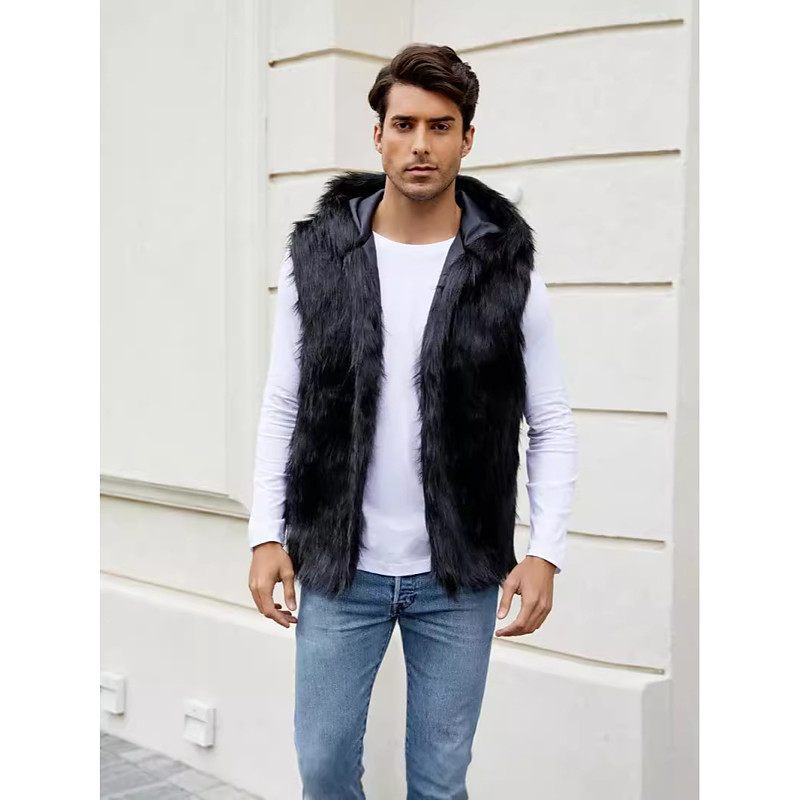 Men's Fleece Vest Hoodie Vest Faux Fur Vacation Casual Daily Wear Going out Fashion Basic Fall Spring Fall Hooded Acrylic Faux Fur Comfortable Plain Zipper V Neck Regular Fit Black White Brown