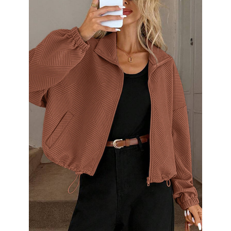 Women's Casual Jacket Comfortable Breathable Zipper Pocket Casual Plain Vacation Street Casual Daily Wear Zipper Short Turndown Regular Fit Long Sleeve Outerwear Black Navy Blue Brown Spring Fall