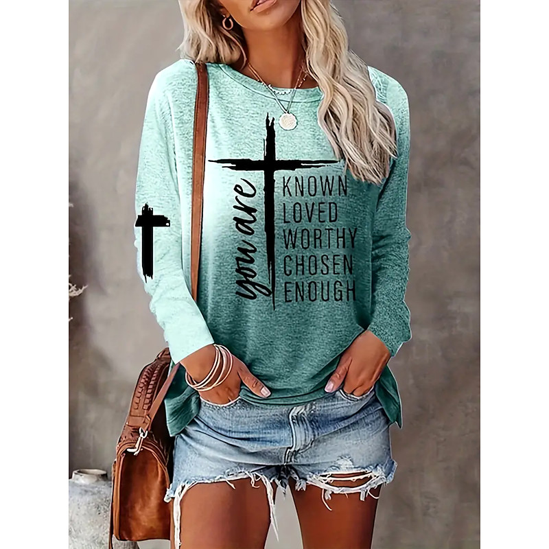 Women's T Shirt Graphic Gradient Letter Vintage Stylish Classic Long Sleeve Crew Neck Regular Tops Daily Print Light Brown Purple Gray Light Blue Spring Fall Winter