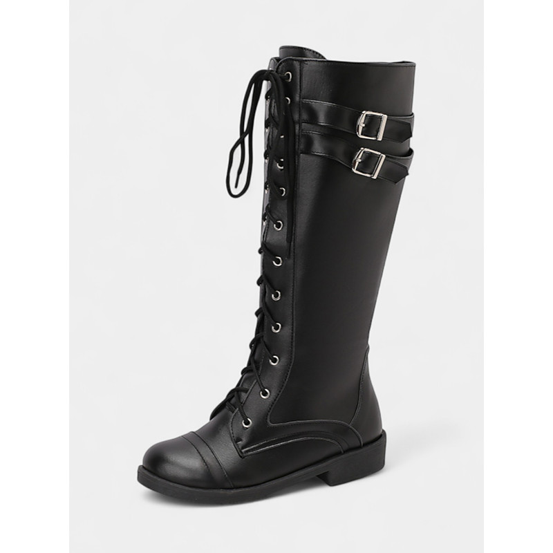 Women's Brown Knee-High Lace-Up Riding Boots – Faux Leather with Buckle Straps for Casual Travel Wear