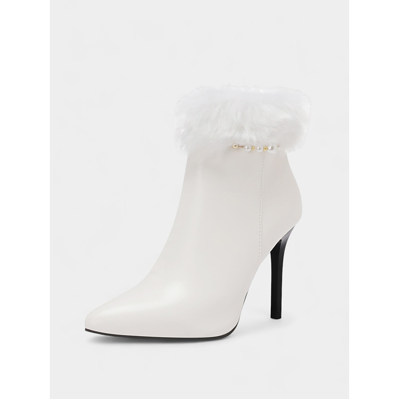 Women's Red Faux Leather Ankle Boots with Faux Fur Cuff and Zipper, Pointed Toe, Stylish Stiletto Heel, Perfect for Christmas, Holiday Parties and Festive Occasions