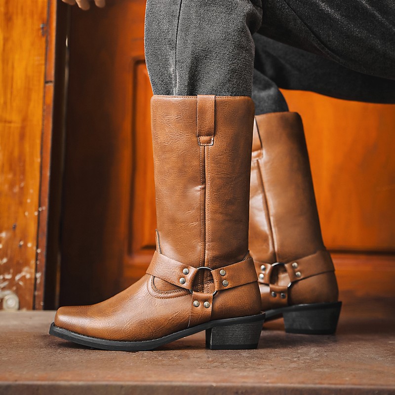 Men's Brown Distressed Faux Leather Motorcycle Boots - Classic Harness Style with Sturdy Construction for Biker and Casual Wear