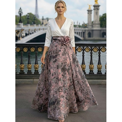 Linea ad A Lunghezza al pavimento Abito da Sera Elegante Quotidiano Floreale Manica 3/4 Scollo a V Matrimonio Formale Chiffon Raso con Stampa floreale Fiori 3D Arricciato