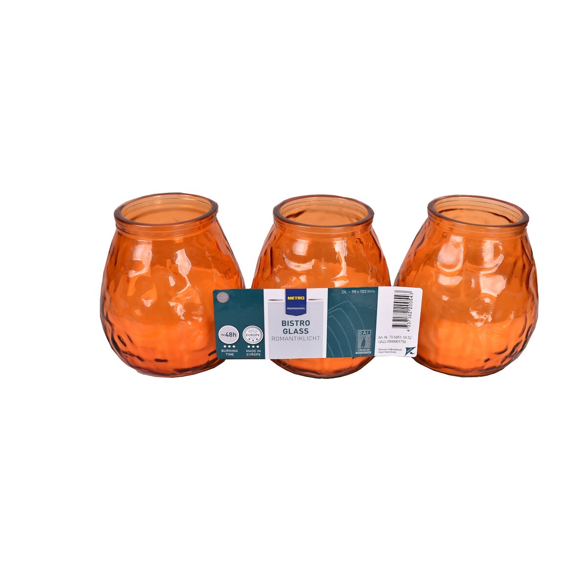 METRO PROFESSIONAL Kerze im Glas, Paraffinwachs, 9.8 x 10.2 cm, ca. 48 Std., orange, 3 Stück