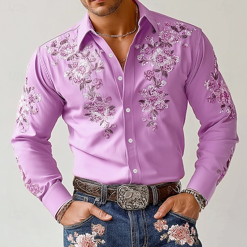 Per uomo Stampa Floreale Fiori Camicia Camicia Western Camicia da cowboy Manica Lunga Vintage Retrò All'aperto Vacanza Primavera Autunno Collo ripiegato Stampa 3D Camicia tipo lino Blu Rosa Viola