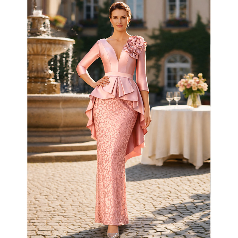 Sheath Column Floor Length Wedding Guest Dress Formal Dresses Evening Gown Mother of the Bride Dress 3/4 Length Sleeve V Neck Elegant Party Wedding Guest Formal Evening Satin Lace with Appliques