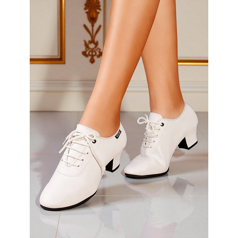 Women's White Cross Strap Ballroom Dance Shoes – Leather Closed Toe Latin Heels for Weddings, Salsa, and Performance Practice