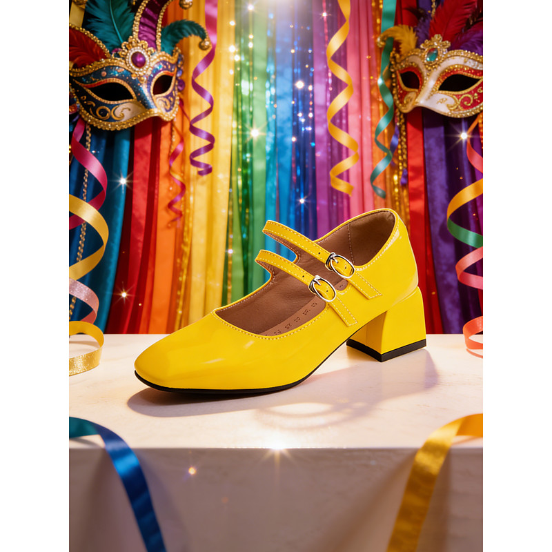 Women's Purple Patent Faux Leather Mary Jane Heels with Double Buckles – Fun Carnival Style, Perfect for Festive Celebrations and Parades