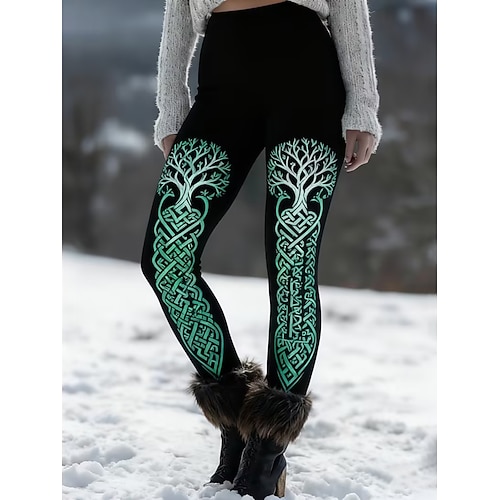 Damen-Leggings im Wikinger-Stil, kuschelig, für Urlaub, Vintage-Look, Ethno-Stil, lange Länge, hoher Bund, grafischer Baumprint, bequem, dehnbar, für Outdoor-Aktivitäten, Urlaub, Freizeit, grün,