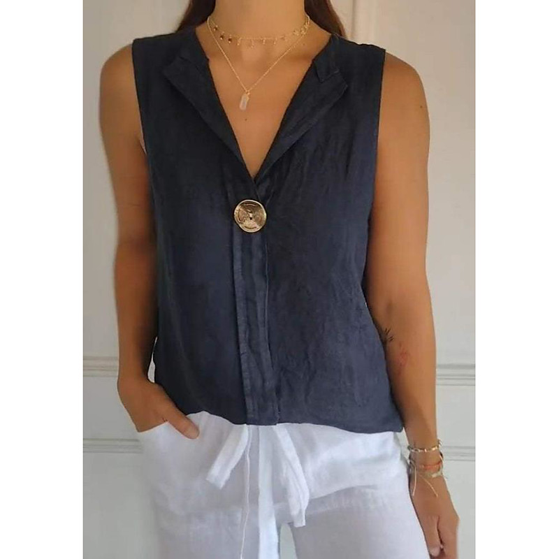 Women's Shirt Blouse Cotton Linen Shirts Plain Stylish Casual Sleeveless V Neck Regular Tops Daily Buttons White Navy Blue Green Khaki Summer