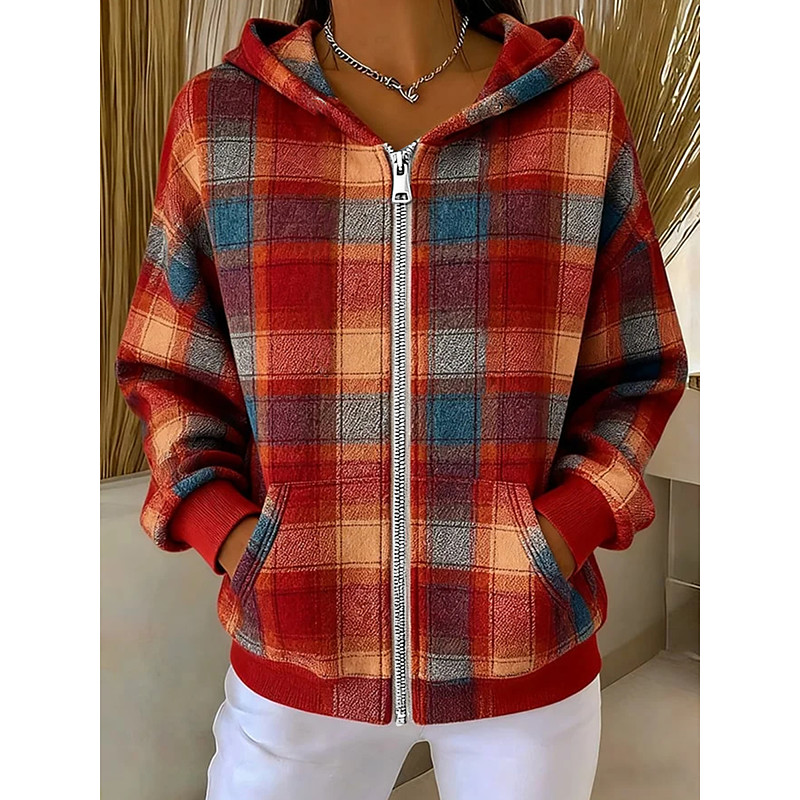 Women's Zip Up Hoodies Graphic Plaid Fashion Casual Long Sleeve Hooded Regular Tops Street Dailywear Patchwork Zipper Pocket Yellow Blue Purple Brown Green Fall Winter