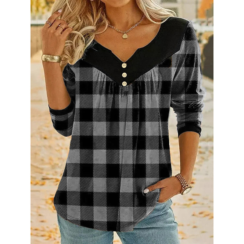 Women's T Shirt Henley Shirt Plaid Fashion Long Sleeve V Neck Regular Tops Daily Weekend Buttons Print Yellow Pink Blue Purple Green Spring Fall